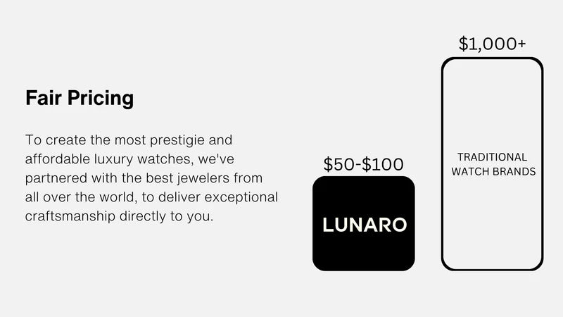 Luxury watch brands often charge 8 to 10 times more — not for better materials, but for the logo. At Lunaro, we skip the status tax. You get premium design and durable components — without paying for celebrities, boutiques, or a heritage museum.